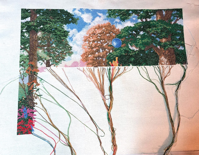 I finished page 2 (upper right) using blending filament and also filled in some ninja stitches. Backstitching did not seem appealing so I moved onto the next page (bottom left). The first two columns, including the bottom corner, are finished. It was fun to stitch those bright reds & pinks, but that entire area will be covered in a plethora of french knots. Good thing I don't mind french knots, but those will be done last as I don't like having them rolled up on the scroll.
